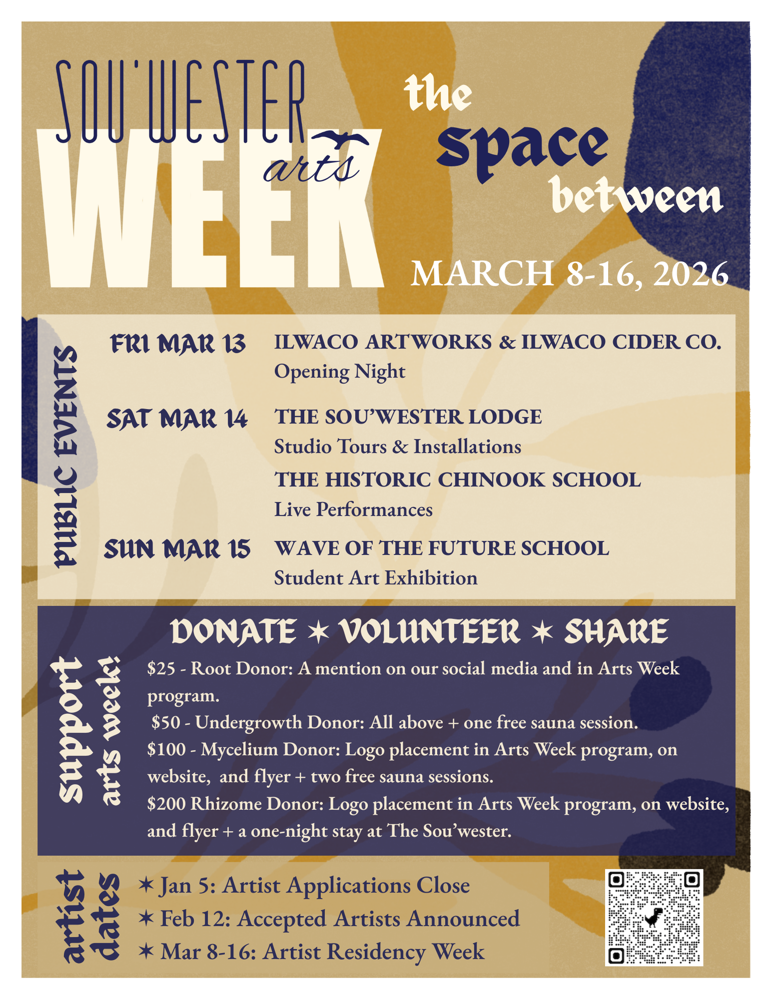 This year, we’re extending that spirit of collective creativity into the wider community by hosting showcases at Ilwaco Cider Co. and the Historic Chinook School.